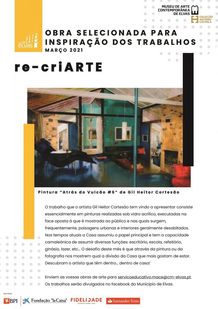 re-criARTE lança o desafio a todos, para que descubram o  o artista que tem dentro… dentro de casa! Com objetos do dia-a-dia, o desafio é, mensalmente, recriar as obras de arte de vários artistas portugueses que integram a Coleção António Cachola em depósito no Museu de Arte Contemporânea de Elvas.