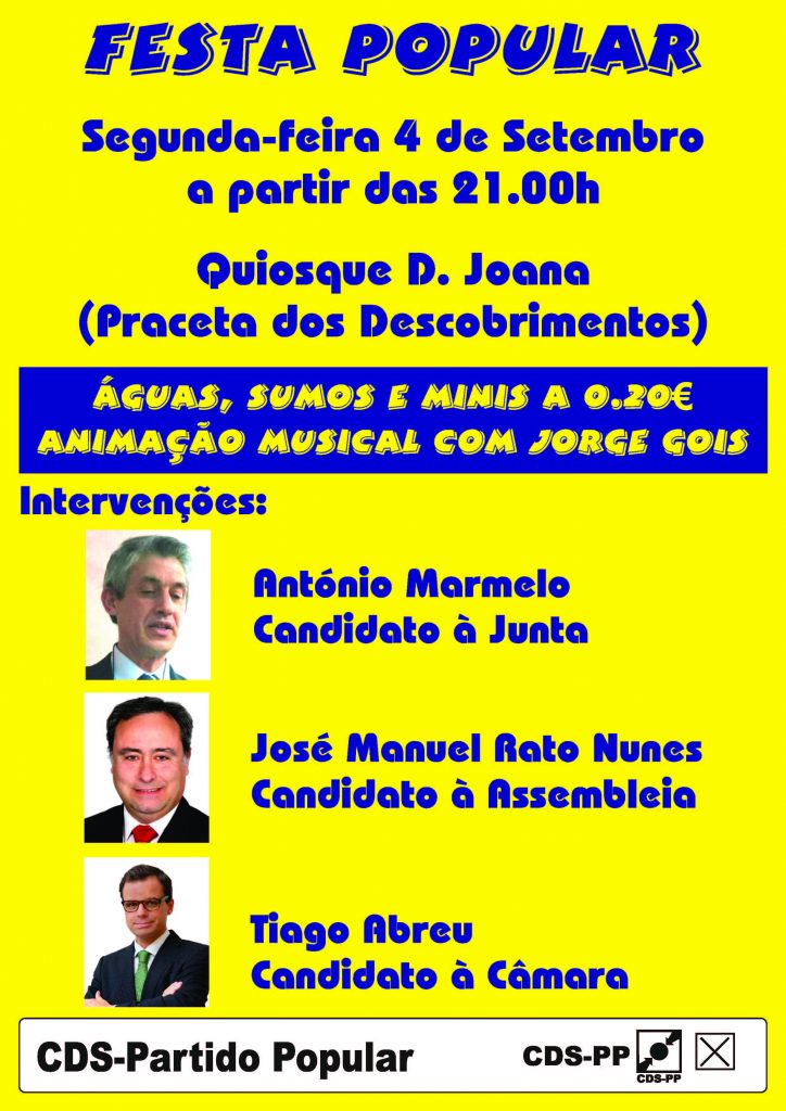 A candidatura CDS + Independentes à Câmara Municipal de Elvas, liderada pelo candidato Tiago Abreu, apresenta a sua lista na Praceta dos Descobrimentos, em Elvas, esta segunda-feira,4 de setembro, pelas 21 horas.