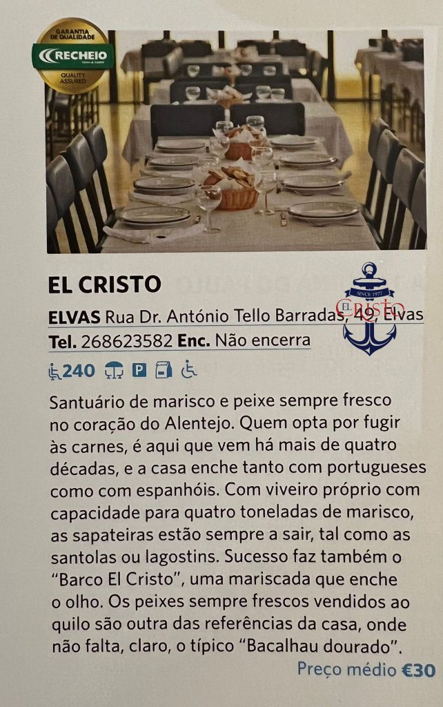 Numa publicação que enumera os Melhores Restaurantes de Portugal no presente ano, em 2022, a marisqueira EL CRISTO, localizada em Elvas, aparece destacada como um “Santuário de Marisco e Peixe sempre fresco no coração do Alentejo”.