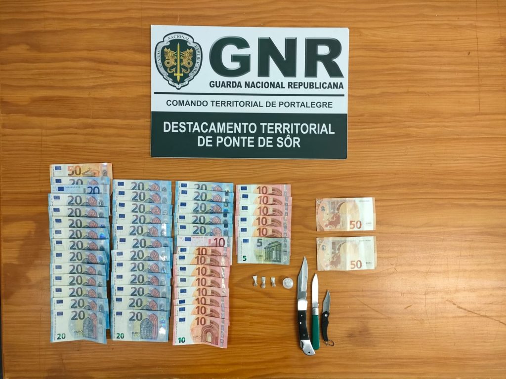 No âmbito do patrulhamento preventivo à cidade de Ponte de Sôr, os militares abordaram uma viatura, em que o seu ocupante demonstrou um comportamento suspeito face à presença dos militares. No decorrer da ação policial, foi efetuada uma revista pessoal de segurança aos suspeitos e uma busca ao veÃculo, onde foi possÃvel detetar diverso produto estupefaciente e apreender oito doses de heroÃna, três doses de cocaÃna, três navalhas, 795 euros em numerário e duas notas falsas de 50 euros.