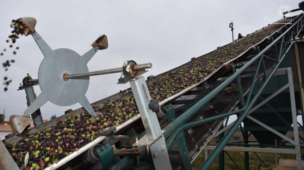 A azeitona segue por tapetes onde é feita a sua limpeza, nomeadamente a separação de ramos de folhas e pedras, por exemplo.