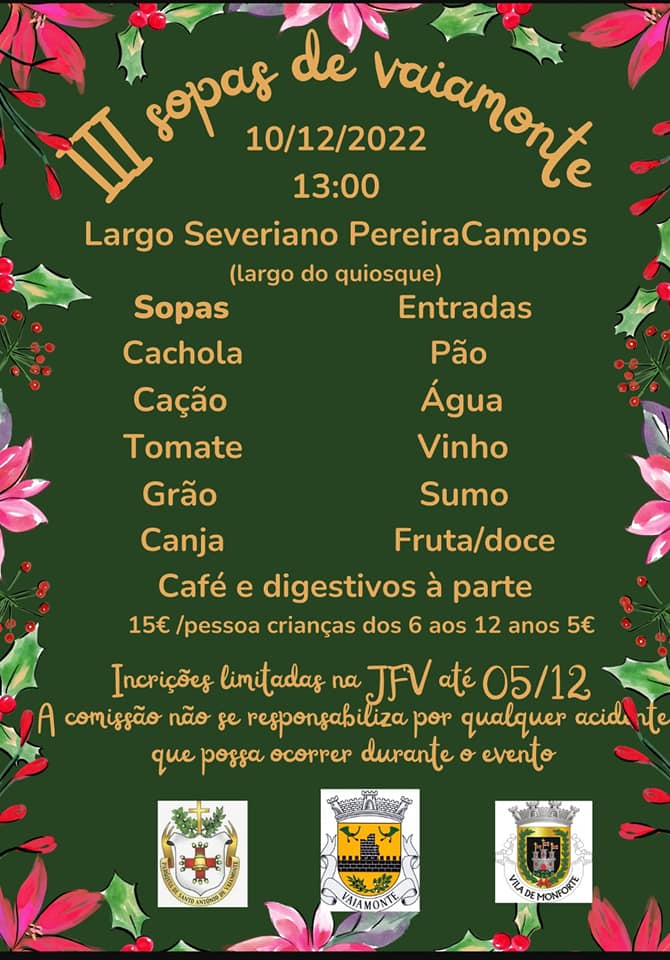 Para os participantes, a organização disponibiliza várias variedade de sopa: cachola, cação, tomate, grão e canja. A iniciativa decorre no largo do quiosque daquela localidade.Também neste dia, em simultâneo, com as Sopas de Vaiamonte, os visitantes têm a possibilidade de fazer compras no Mercado de Natal.