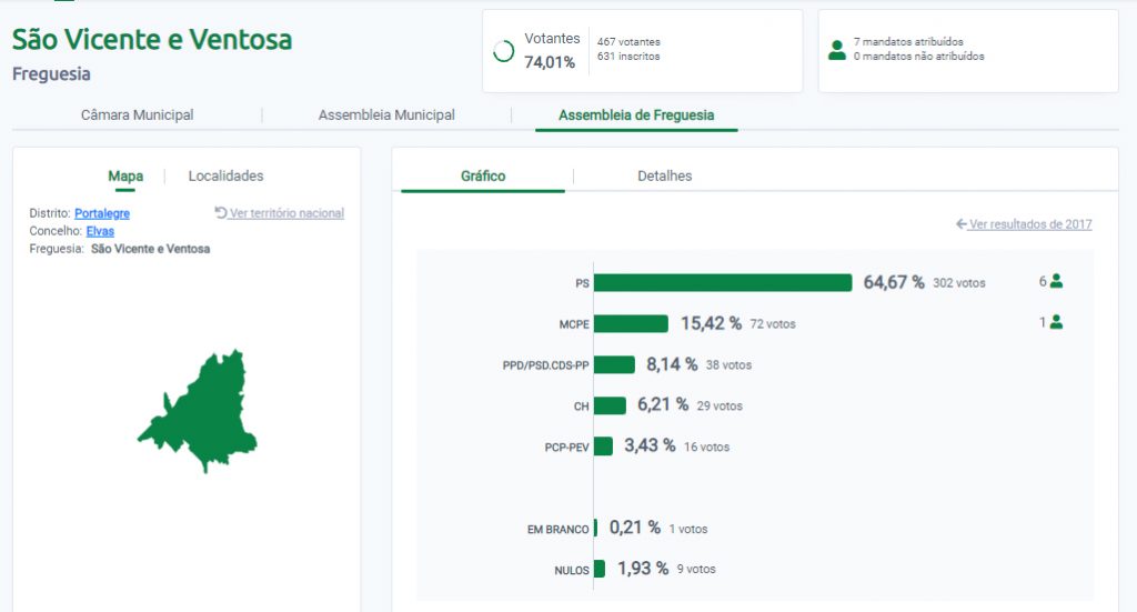João Charruadas foi eleito presidente da Junta de Freguesia de São Vicente e Ventosa, no concelho de Elvas, pelo Partido Socialista, com 64,67 %, a que correspondem 302 votos, elegendo seis mandatos.