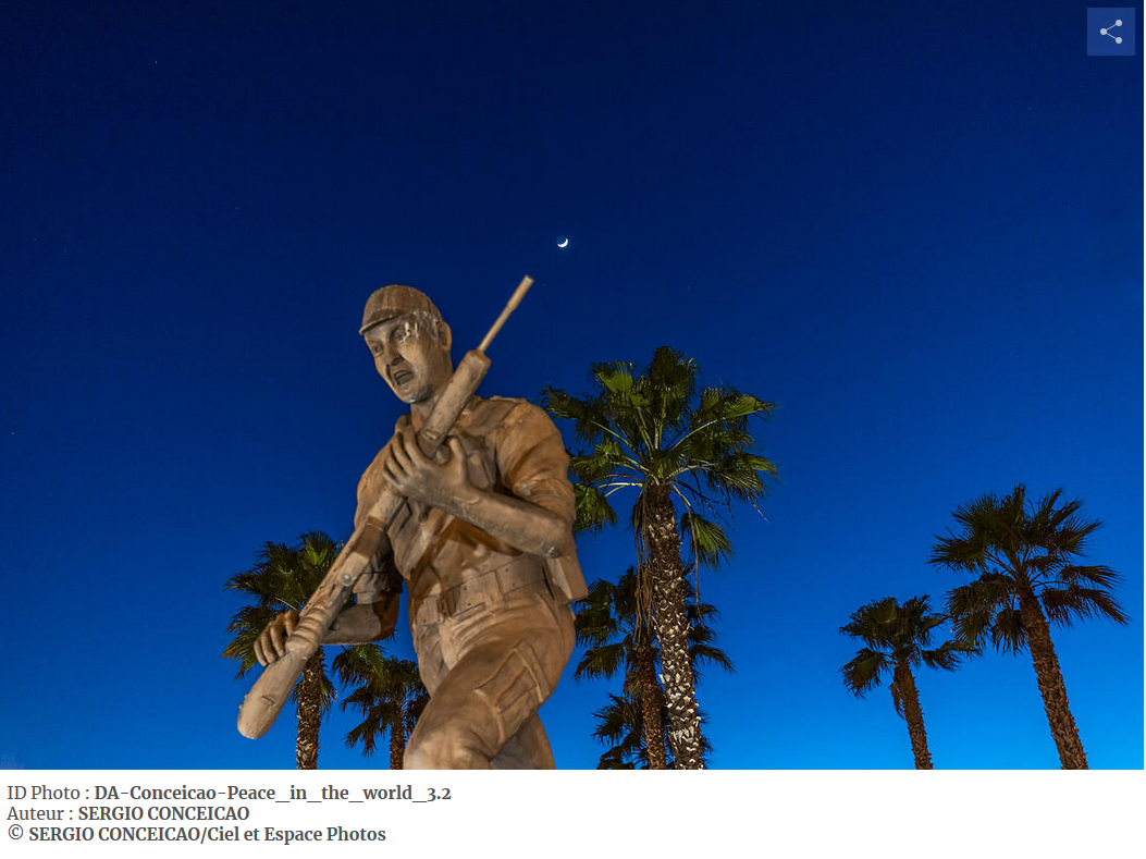 Já na terceira imagem é possível visualizar um Earthshine Lunar alinhado com a estátua do militar próxima do campo de futebol em Elvas, simbolizando com a imagem a Paz no Mundo.