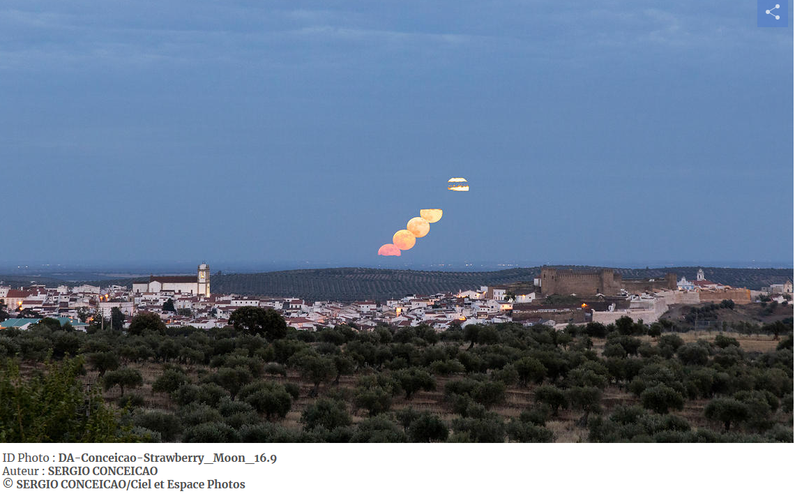 Na fotografia captada em Campo Maior consta o crescimento da Lua de Morango e o Castelo de Campo Maior.